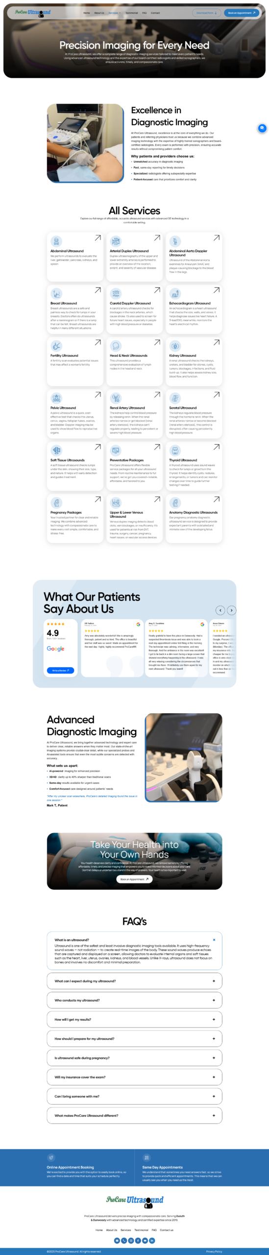 ProCare Ultrasound’s existing website was outdated, difficult to navigate, and not optimized for patient conversions. Visitors struggled to find key services, and the booking process was fragmented across multiple tools, leading to missed appointments and poor tracking. The site also lacked clear trust signals and modern mobile optimization, which is critical for medical practices.